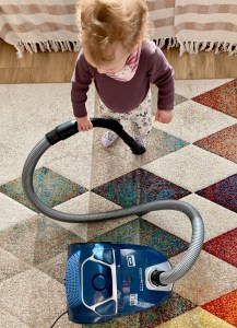 Másol, utánoz, részt akar venni mindenben. Nem érdeklik az elméletek, a szabályok, még az sem, a másik minek örülne. Csak figyel, és szívja magába a tudást. Ha főznék, ott a lábam körül, ha port törlök, kér egy rongyot ő is, ha előveszem a porszívót, akkor kiveszi a kezemből.