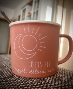 Én magam is szeretem a reggeli kávézást, ami olyan számomra, mint a gyújtás a kocsinál. Elindít a napra. De kaptam egy új bögrét egy keresztyén webshop-ból, amin az áll: tölts fel, reggel, délben, este. Tetszik benne, hogy szabadon van hagyva, mi vagy éppen ki cselekszik.